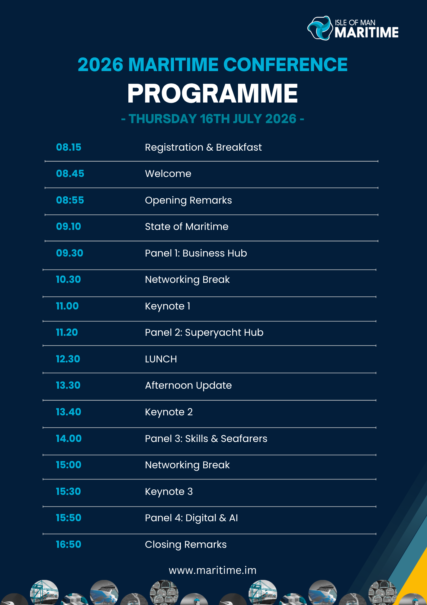 Focused on industry-led discussion, innovation and partnership, the event creates valuable opportunities for knowledge-sharing, networking and commercial connection. For sponsors, it offers direct access to a targeted maritime audience, meaningful brand visibility, and the opportunity to align with the continued growth and future direction of the maritime industry on the Isle of Man and beyond.
